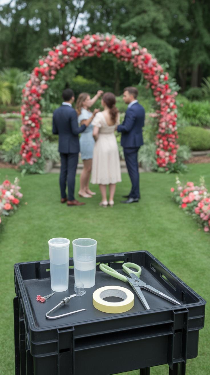 First, before the event begins, if your arch has floral foam or water tubes, ensure they’re well soaked. It helps if you keep extra water nearby to top up as needed. If the arch is outside, try to set it up in a shaded spot, particularly if it’s a sunny day. Sun drains moisture quickly, and heat wilts blooms fast.