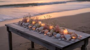 - Mason jars with candles or flowers – a classic and budget-friendly choice.