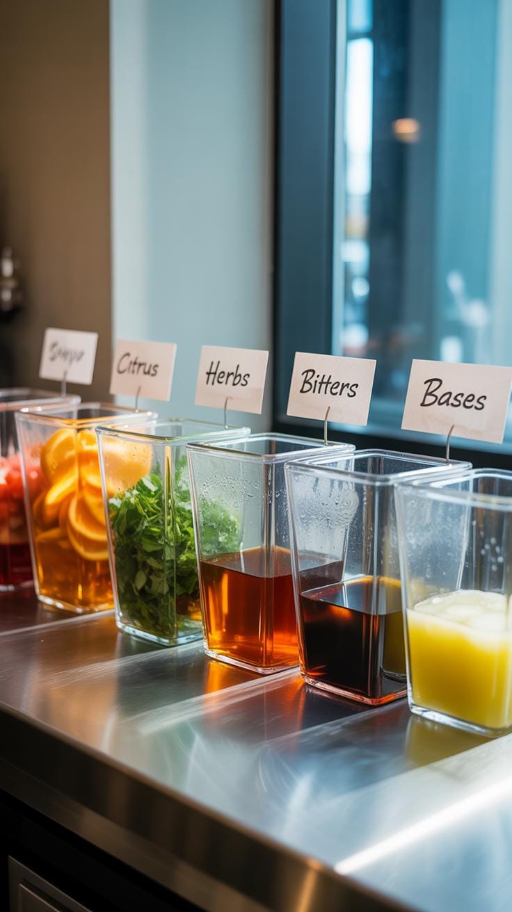 Ingredients that aren’t stocked in bulk—like fresh garnishes, bitters, or syrups—should be arranged in a neat line or compact container so you can grab what you need without a second thought. Leaving some free counter space between your prep area and where you plate drinks is a small thing, but it helps keep the flow going and surfaces clear.