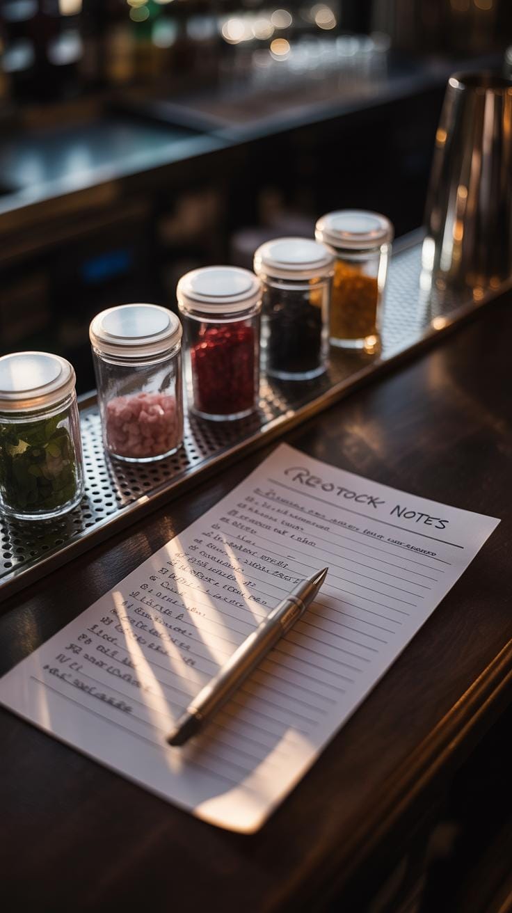 Stock levels aren’t just about refills. Take notes on anything running low or missing completely. Maybe your bitters bottle is down to a trickle, or fresh fruit feels less than fresh. Write it down before it slips your mind. You might also spot damaged equipment—broken jiggers or worn bar mats—that should be fixed or replaced.