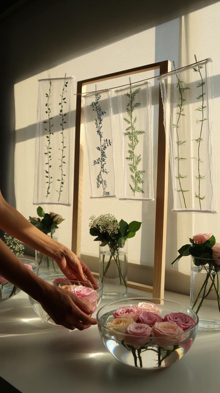• If using a water container, gently place flowers directly on the surface. They will naturally float, creating a calm, airy vibe.