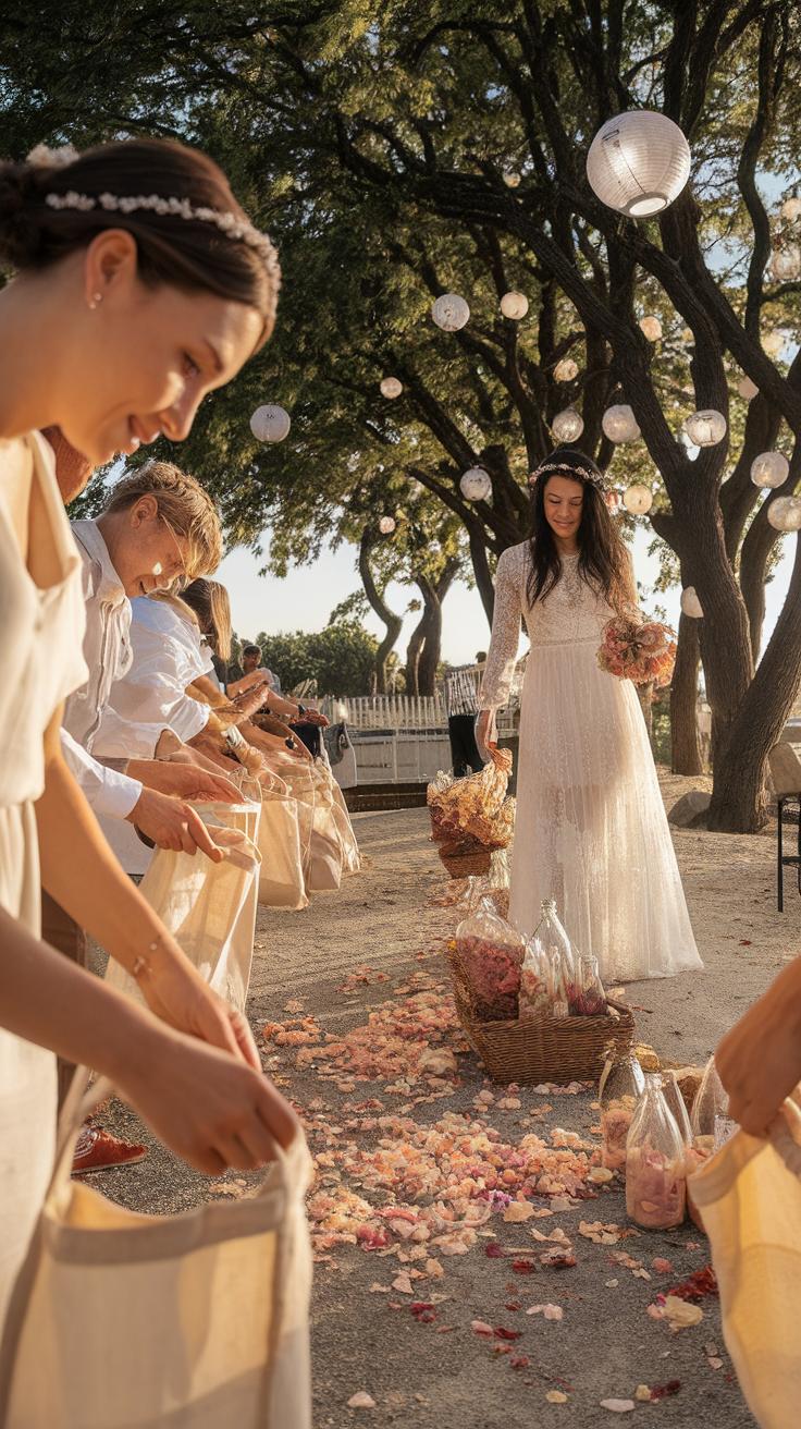 Consider using flowers sparingly as accent pieces rather than the main focus. Small bouquets tied to chairs or scattered petals on the aisle look elegant without clutter. Bring in wooden elements like handcrafted benches or simple lanterns that complement the outdoor feel. Stones, whether smooth river rocks or painted pebbles, add texture and can serve as paperweights for table settings or guest notes.