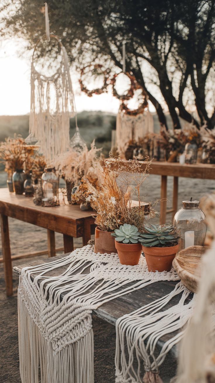 You could also create a mix by combining these items: a wooden arch wrapped with vines and wildflowers, or stone bowls filled with water and floating blossoms. Choosing items that reflect your outdoor surroundings helps your decor blend naturally. What natural items can you find near your venue to incorporate into your design?