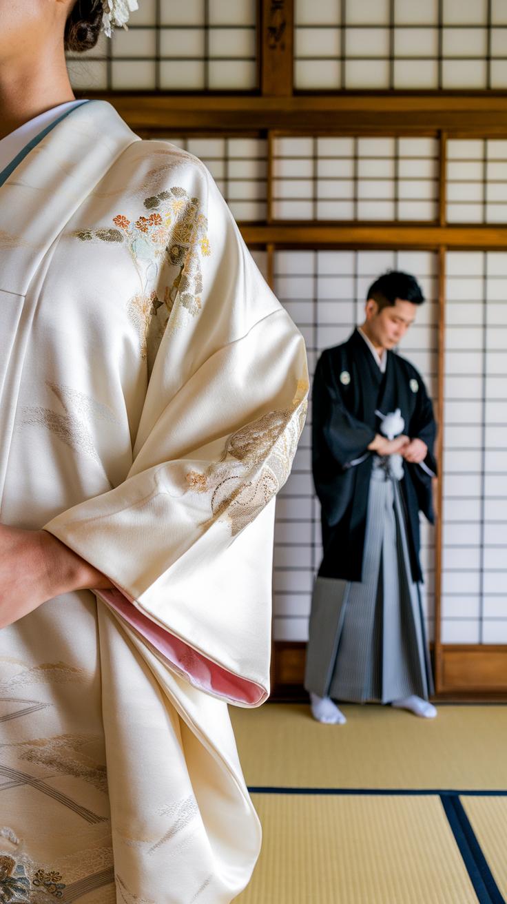 Grooms wear formal montsuki kimonos, which are black with family crests. This attire shows respect and tradition. The carefully chosen colors and designs in wedding garments create a visual story and connect the couple to Japanese culture.