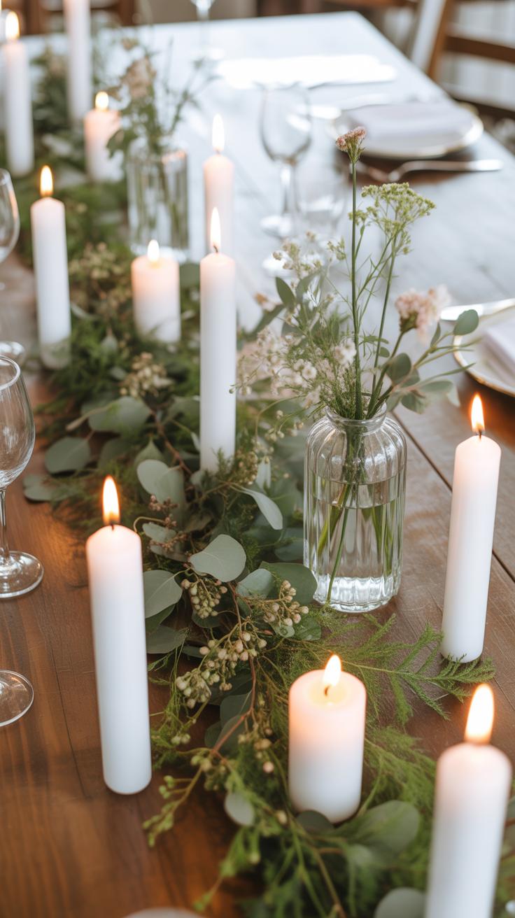 Cheap materials like greenery clippings, candles, and simple glass jars can come together nicely if arranged thoughtfully. For example: