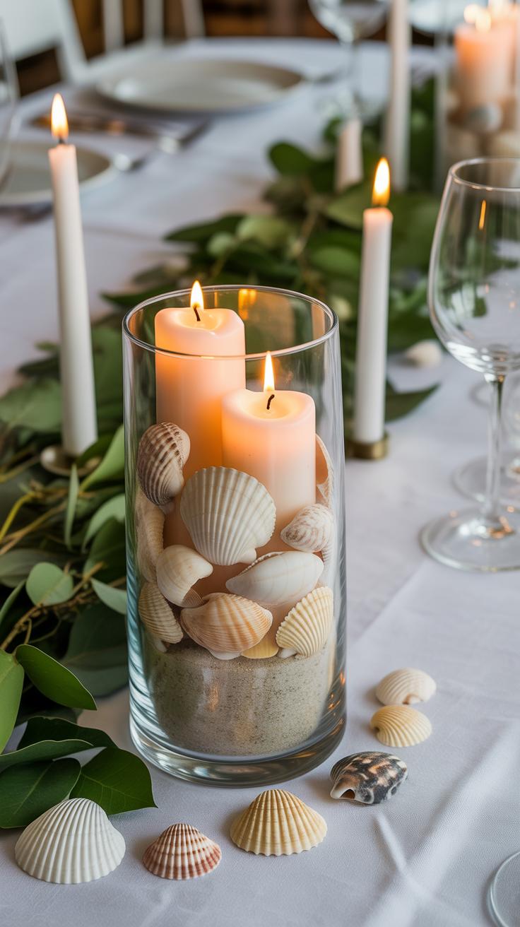 For a beachy yet elegant vibe, include candles or fairy lights nestled among the shells. They bring warmth and a gentle sparkle when the lights dim. You might want to experiment with colors, too. Painting some shells or adding subtle metallic accents helps tie the centerpiece to your wedding palette.