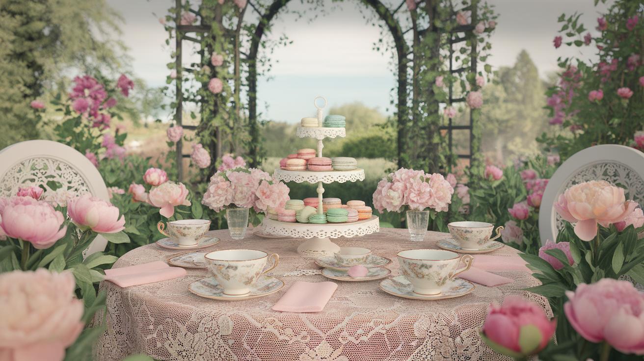 Themed props like antique books, lace doilies, or decorative birdcages anchor the style without overwhelming the space. Place these thoughtfully to maintain clear table space for food and tea service.