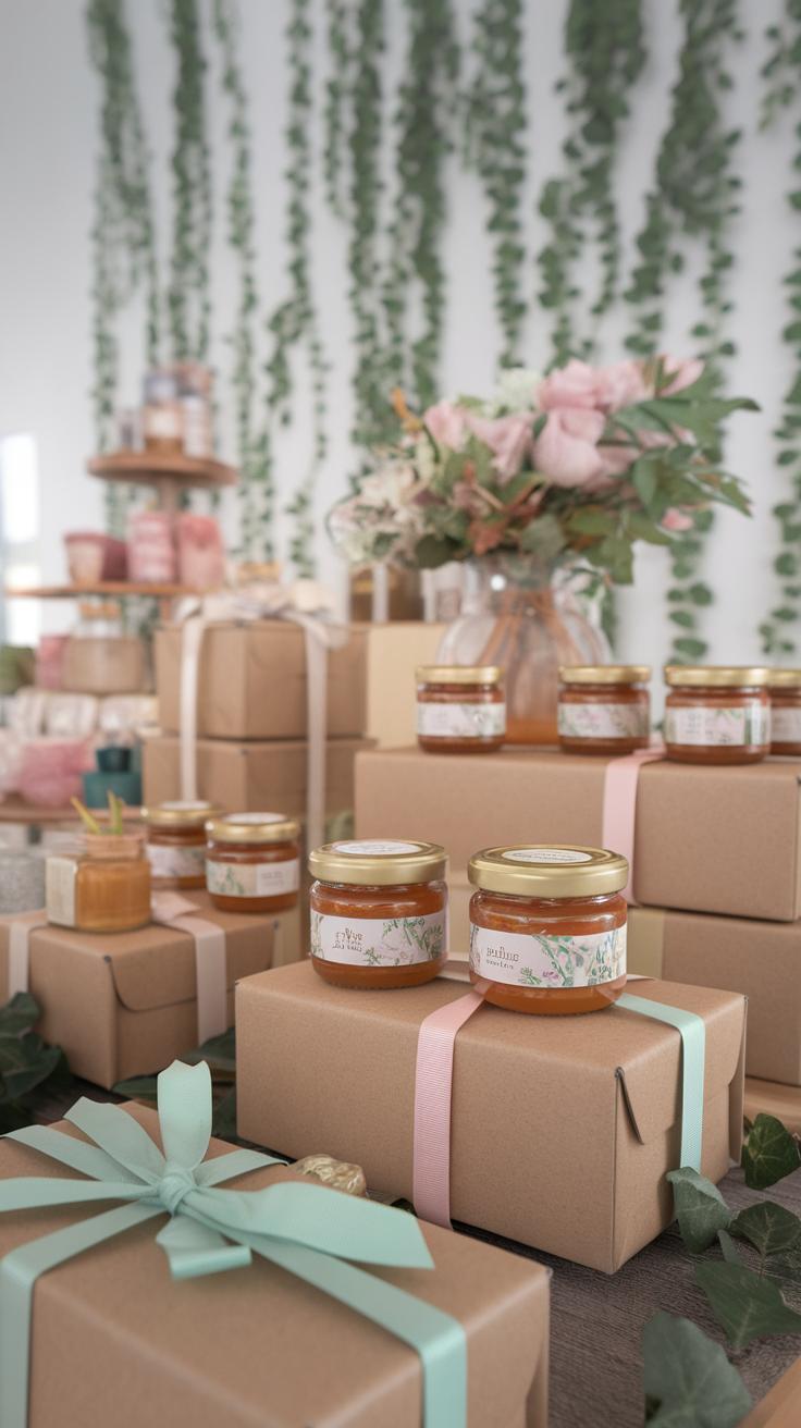 Miniature jars of honey also work. They pair well with tea and can be bought or homemade. Labeling each jar with a cute message adds a warm, personal touch.
