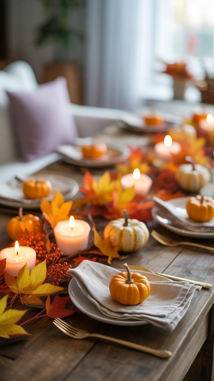 - Centerpieces: Think small vases with a few branches or seasonal fruits like mini pumpkins, arranged neatly. Even candles can work, as long as they don’t crowd the space.