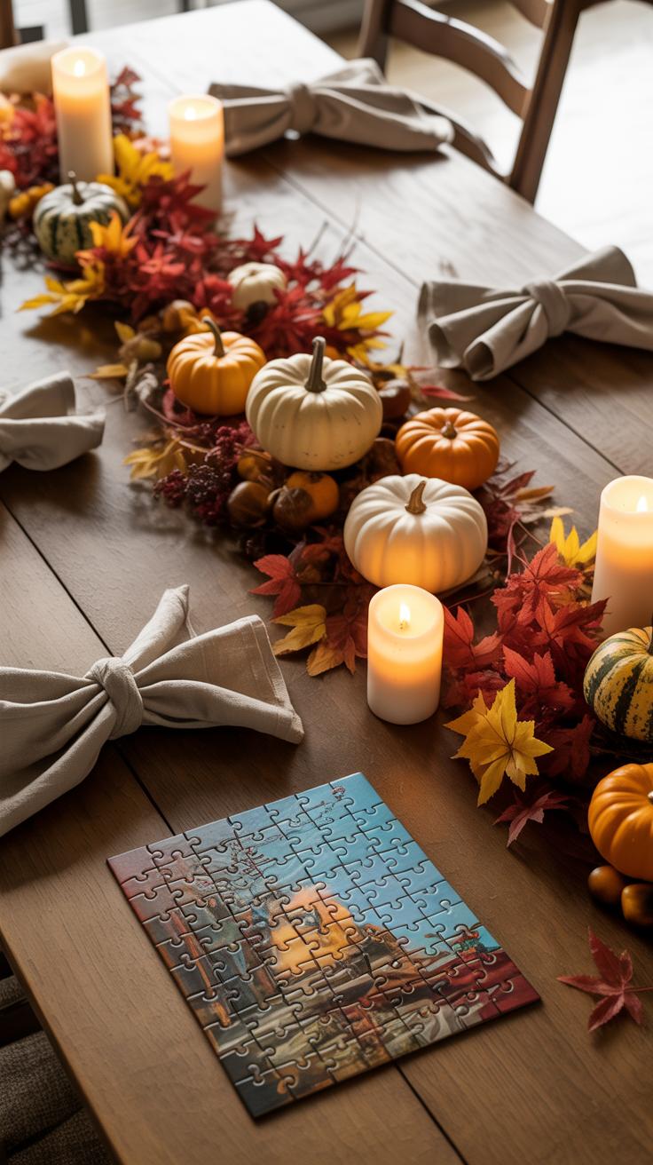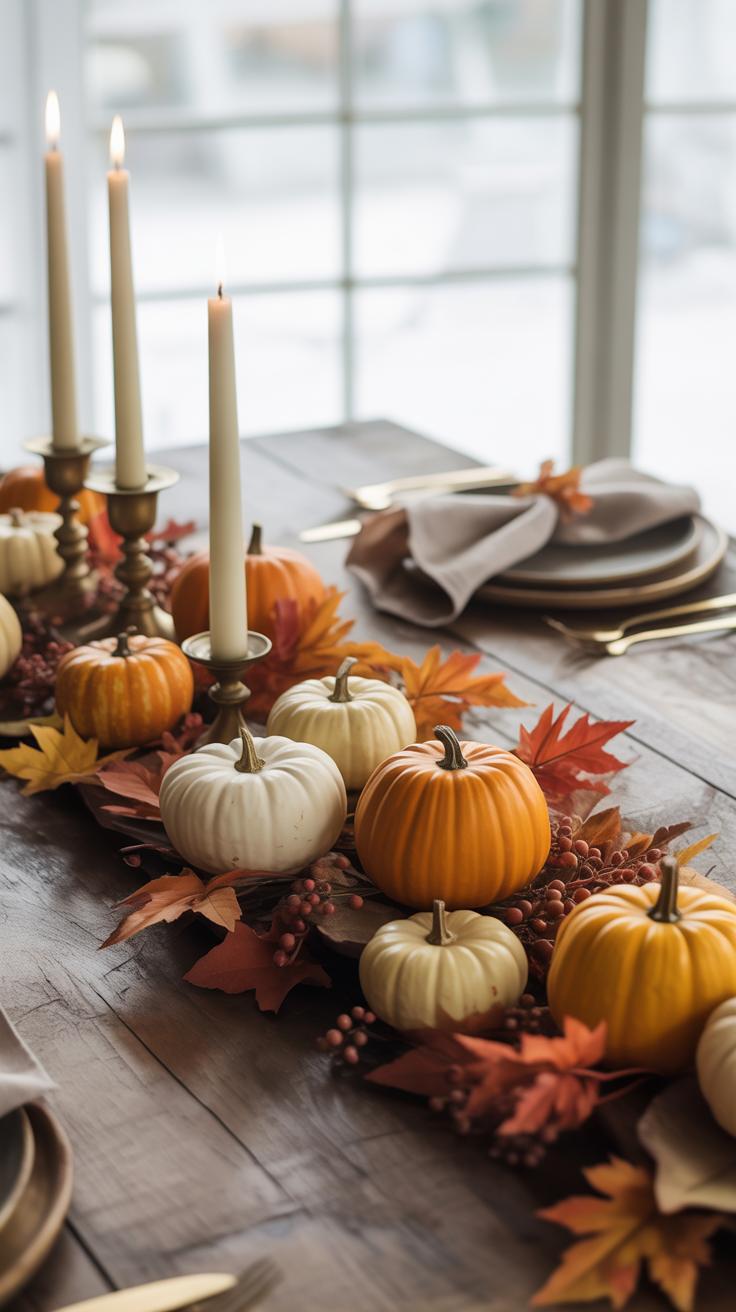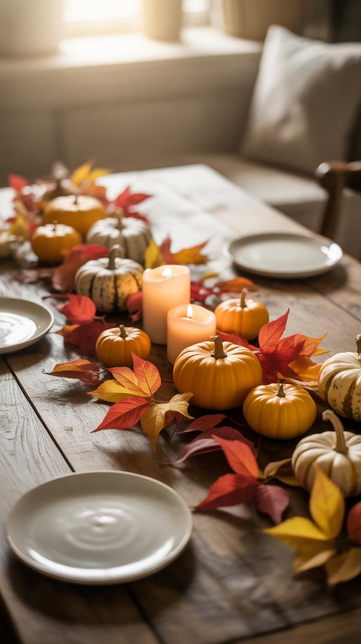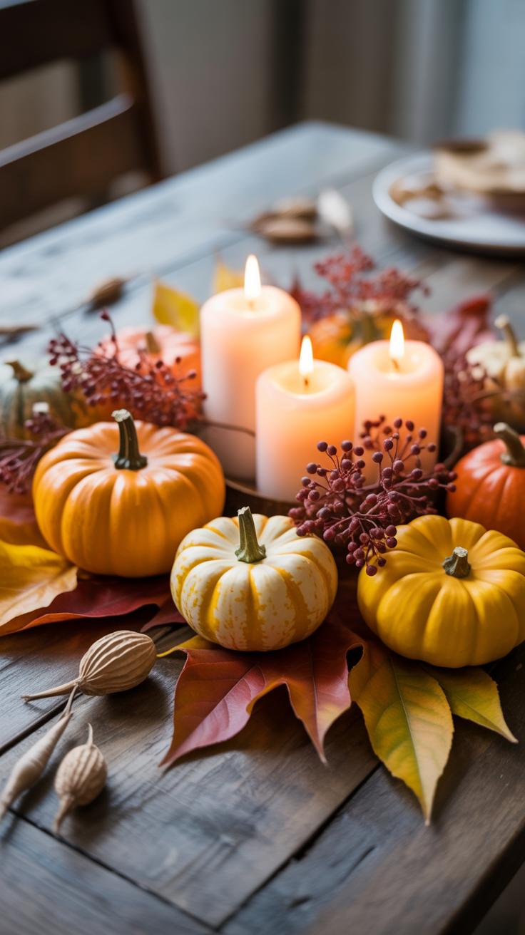 Another idea is to place a wooden board or a plain tray at the center and arrange seasonal fruits like small pumpkins, apples, or pears on it. It’s an easy way to bring some natural color and texture without going overboard. You might add a small bunch of fresh herbs or a couple of votive candles for interest.