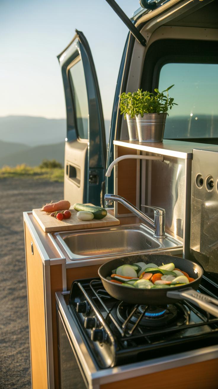 Keep your utensils simple. A few good knives, a cutting board, and some nesting pots or pans go a long way. Using stackable containers for food and cookware helps keep things neat and accessible. Don’t forget a collapsible sink or basin for washing; it saves water and space.