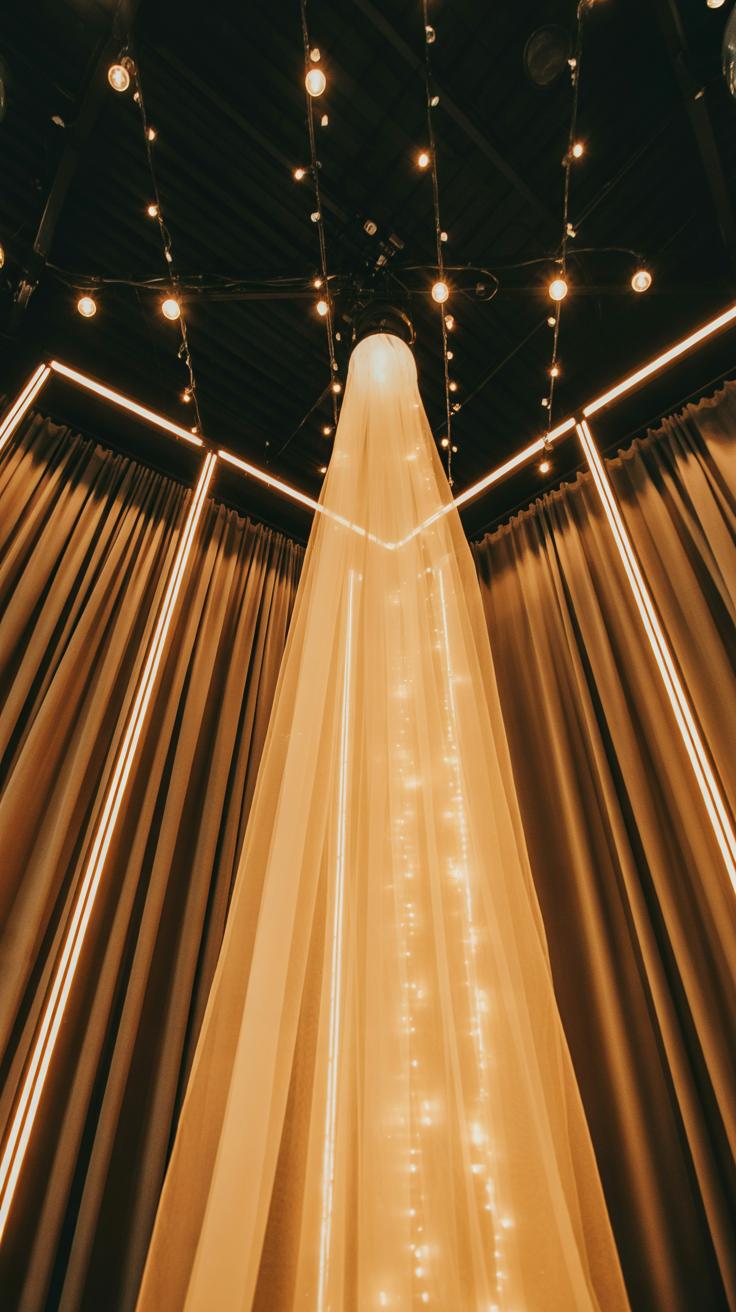 Lighting and fabric can completely change how a wedding backdrop feels. The interplay between the two often sets the mood without even needing extra decor.