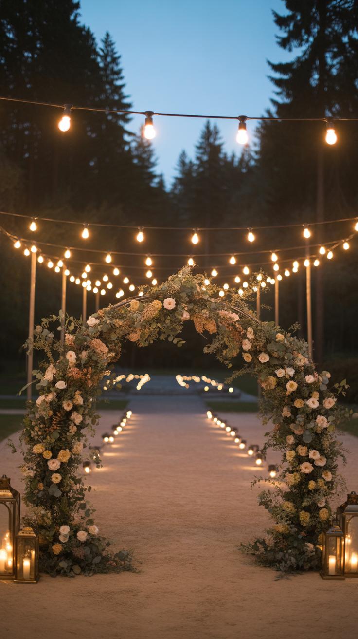 String lights and fairy lights are often the go-to when you want to bring warmth and a gentle glow. These lights are subtle but powerful—they wrap around beams, hang from trees, or drape across your backdrop like delicate threads of light. Because they’re soft and scattered, you get an intimate, cozy feel that draws people in rather than pushes them back.