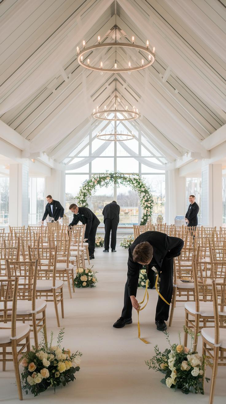 Lay out all chairs near their spots before placing them. This prevents repeated trips and helps you see if the quantity matches the plan. Use a measuring tape to keep rows straight and aisles wide enough.