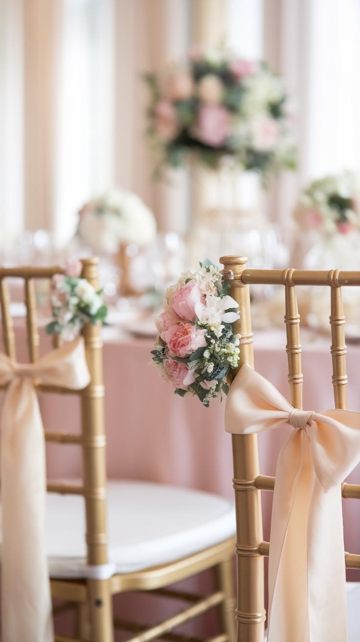 Attach these accents carefully using ribbon loops, floral wire, or reusable hooks to avoid damage to chair surfaces. Secure arrangements so they stay in place even with movement or wind outdoors.