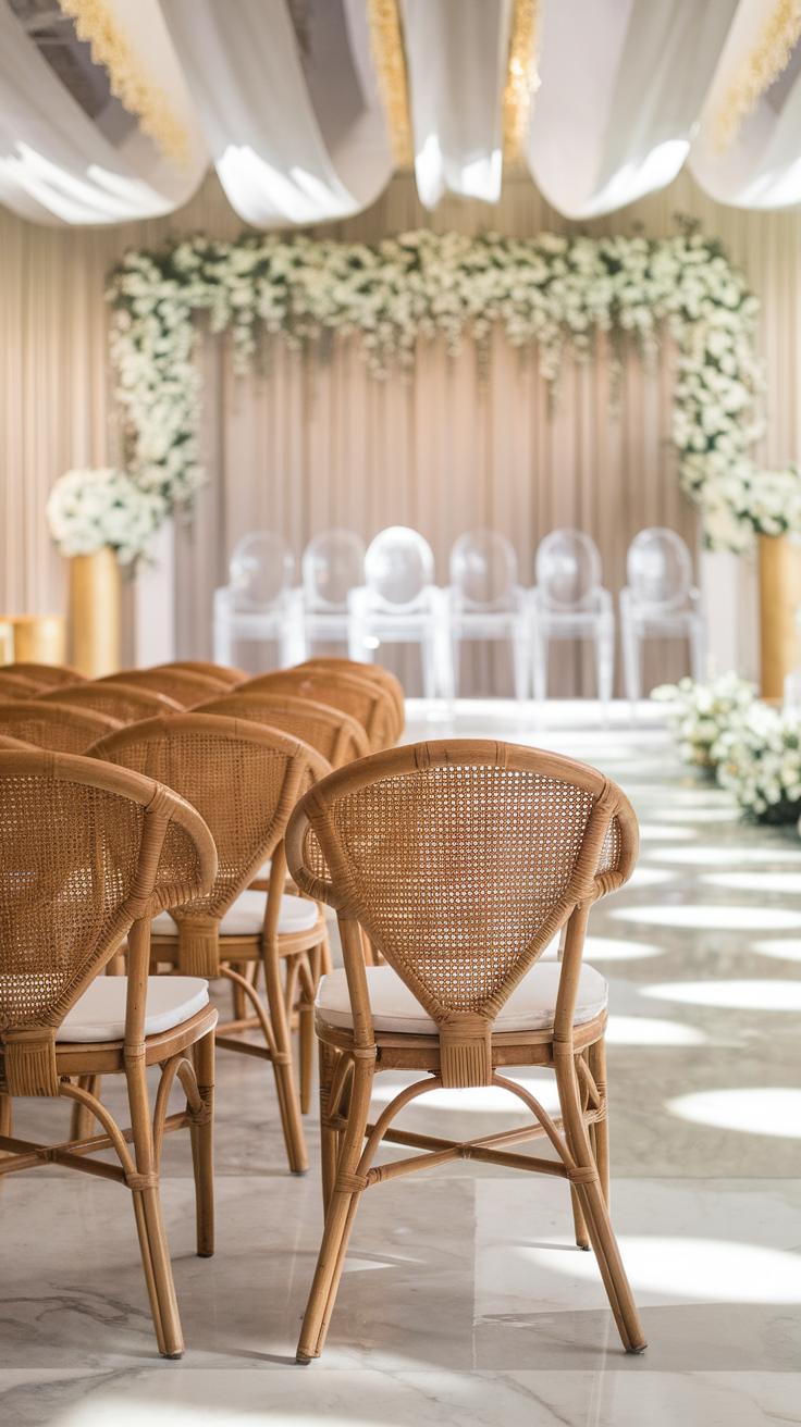 Modern weddings call for sleek options such as ghost chairs or metal designs. For an elegant ballroom event, Chiavari chairs with cushions create a refined atmosphere. If your theme is garden or boho, consider rattan or mix-and-match styles to emphasize a relaxed, personal vibe.