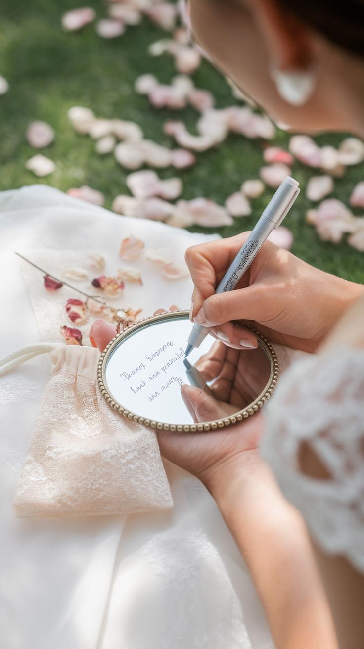 Handwritten notes on the mirror, placed by you or your guests during the ceremony or reception, create a heartfelt layer of meaning. You can also paint delicate designs or symbols that reflect your story together.
