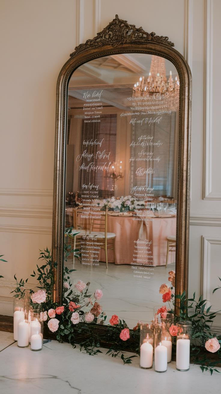 Have you noticed how mirrors naturally invite a second glance? Use this to your advantage for important signs that guests might overlook otherwise. When practical information doubles as decor, your wedding gains a touch of thoughtful detail without extra expense or complexity.