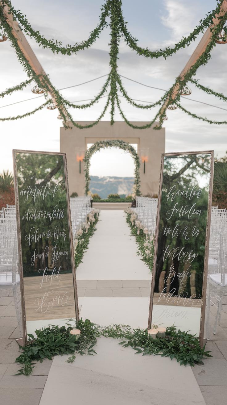 Mirrors serve as functional spaces for posting directions and menus without needing extra boards or signage stands. Use a mirror near the entrance to show your welcome message alongside arrows pointing to key areas like the ceremony site, bar, or restrooms. This avoids clutter and keeps your design streamlined.