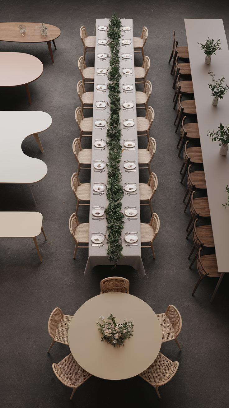 A mixture of elements with varying heights works here too, but keep the tallest elements aligned to the center to avoid blocking guests across the table. Consider adding textural pieces like lanterns or candles to add dimension to longer tables while maintaining clear sightlines.