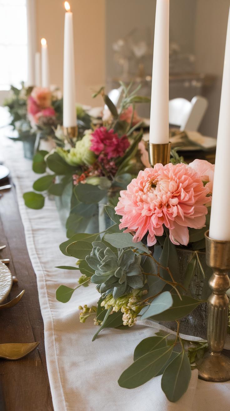 Greenery works well with almost every flower type. Eucalyptus gives a silver-green tone and a fresh scent. Ferns add soft texture, while ivy can drape elegantly over the table edges. Mixing different shapes and shades keeps arrangements interesting. For candles, tall taper candles in simple holders create a classic look. Small votive candles scattered around bring gentle warmth and glow.