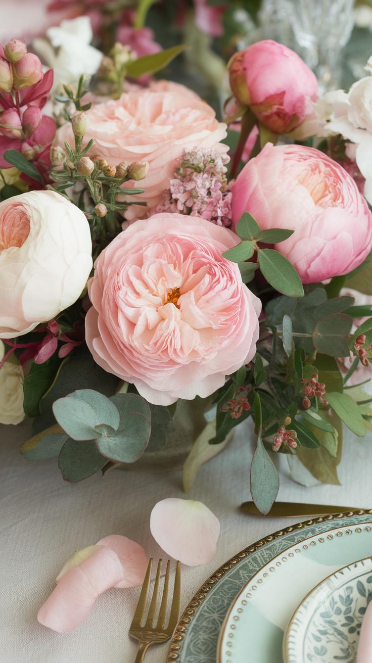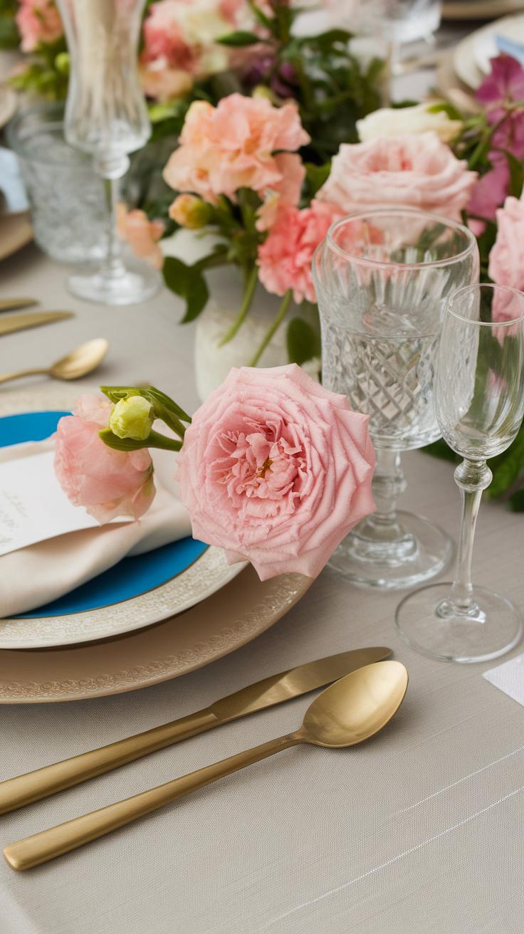 Glassware can reflect floral colors or pick up on greenery hues. Cutlery style also matters. Delicate flower choices pair nicely with elegant silver, while bold blooms suit chunky or vintage pieces.