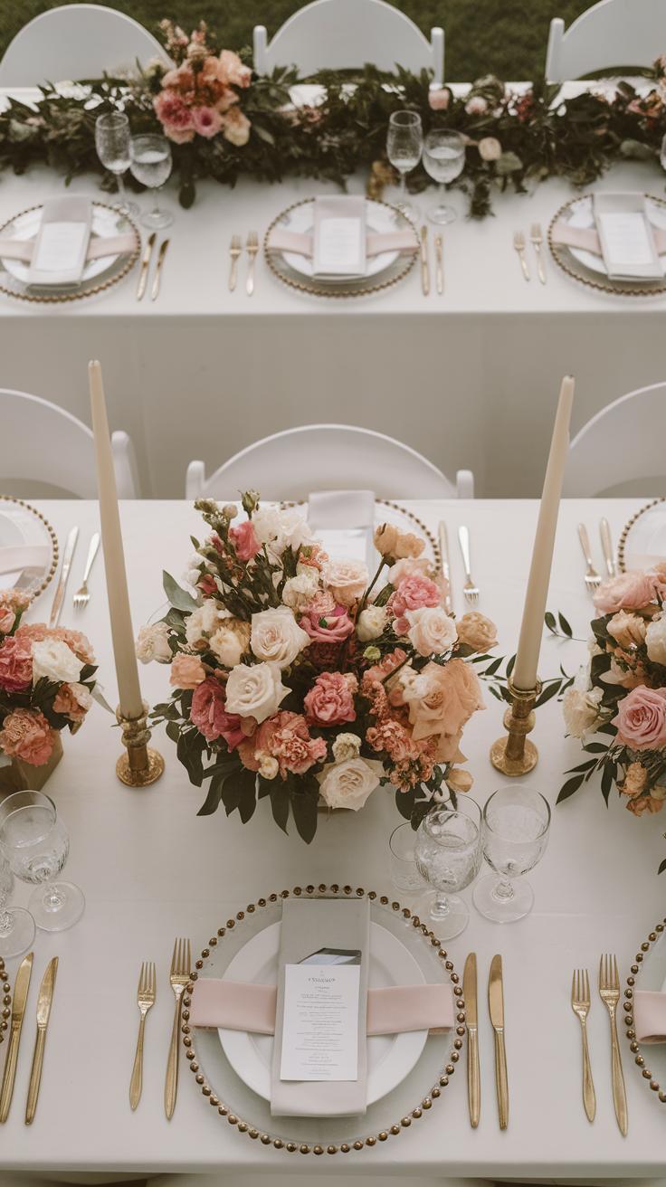 Garlands run along the length of the table, made from greenery mixed with flowers or just blossoms alone. They bring a soft, flowing effect and leave room for dishes and glassware. Some couples choose garlands instead of traditional centerpieces to keep tables open and inviting.