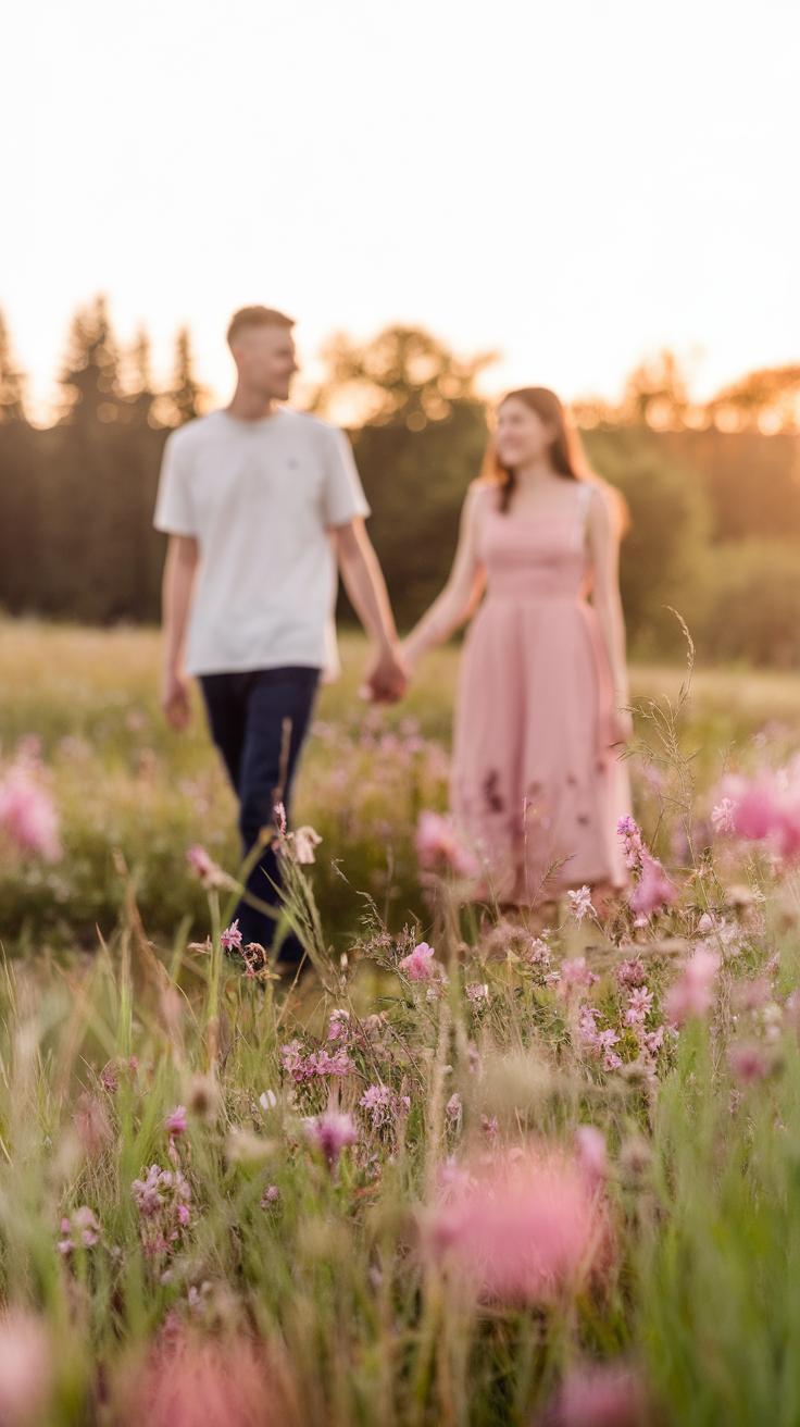 Encourage the couple to interact with flowers naturally. Walking hand in hand through a field, gently touching petals, or smelling blooms create relaxed and authentic photos. Sitting or lying among flowers can show intimacy and connection to nature.