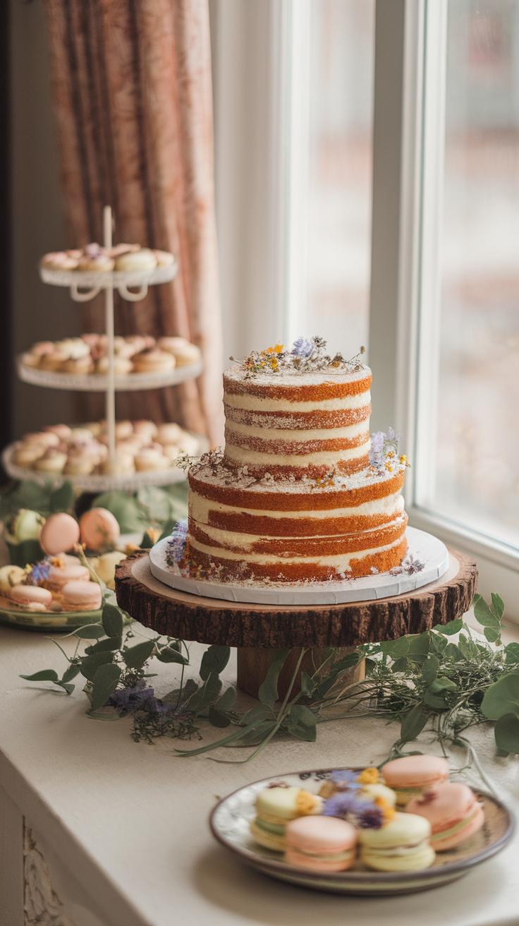 Your cake can continue the theme by using floral decorations. Whether you choose fresh flowers planted directly into the cake or sugar-crafted blossoms, the effect will be stunning. Keep the shape and design simple to let the flowers stand out, ensuring the cake matches the natural, elegant feel of your celebration.