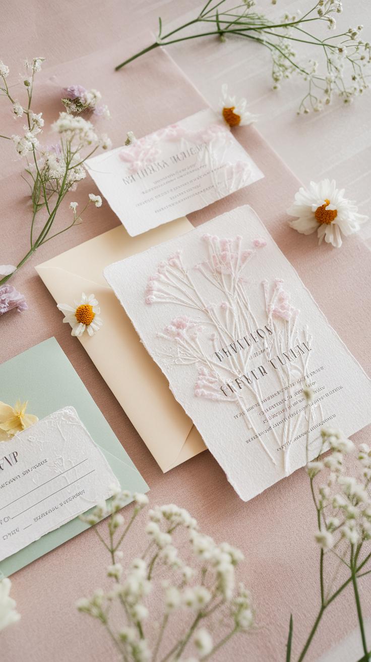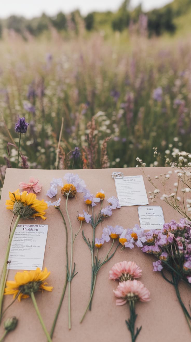 Wildflower illustrations bring the invitations to life. You might choose delicate watercolor drawings or more graphic prints depending on your style. Pressed flowers add a unique touch; slipping a small dried bloom into the envelopes can surprise and delight your guests with a genuine piece of nature.