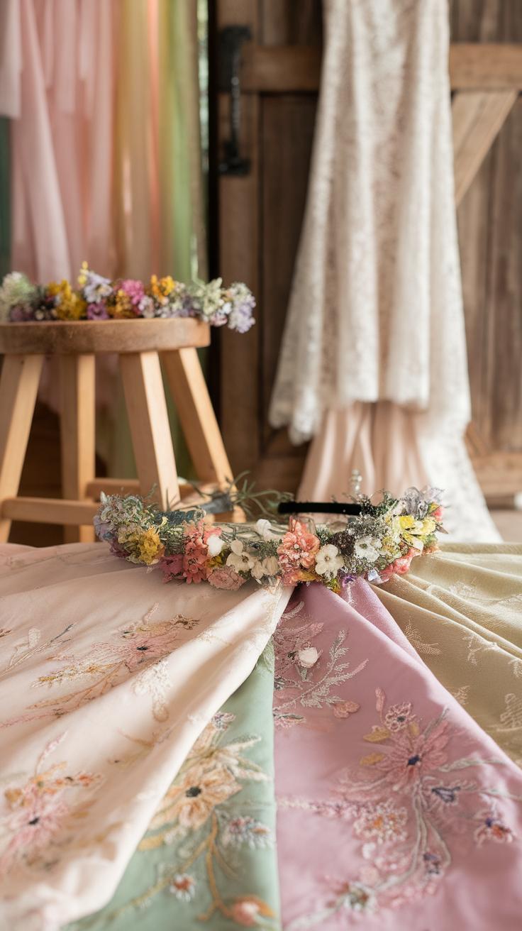 Your wedding attire offers key chances to bring the wildflower theme into the overall look without overwhelming simplicity. Consider floral hair accessories like delicate sprigs of baby’s breath or small daisies woven into a loose braid or pinned above an ear. These details keep the style natural and fresh.